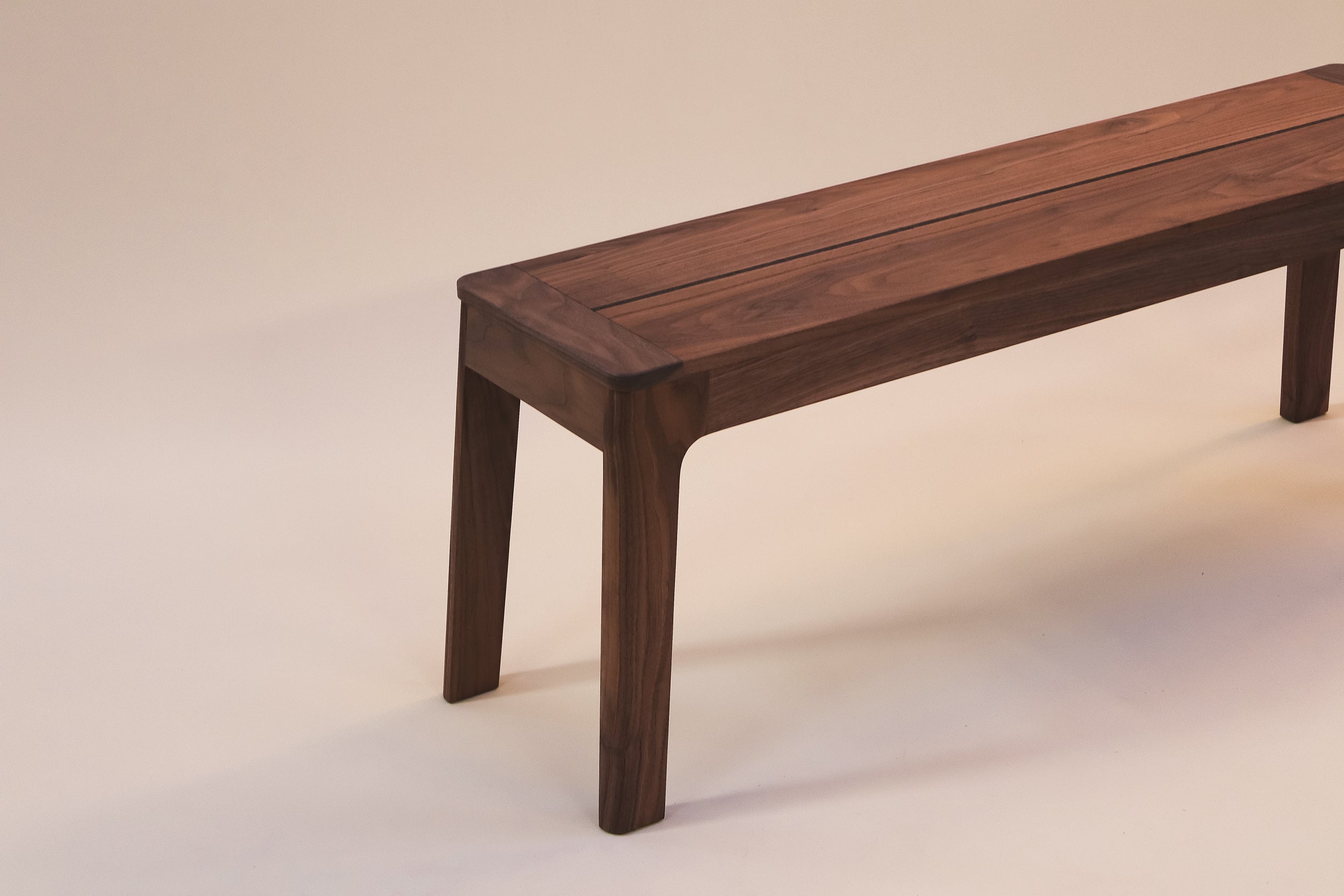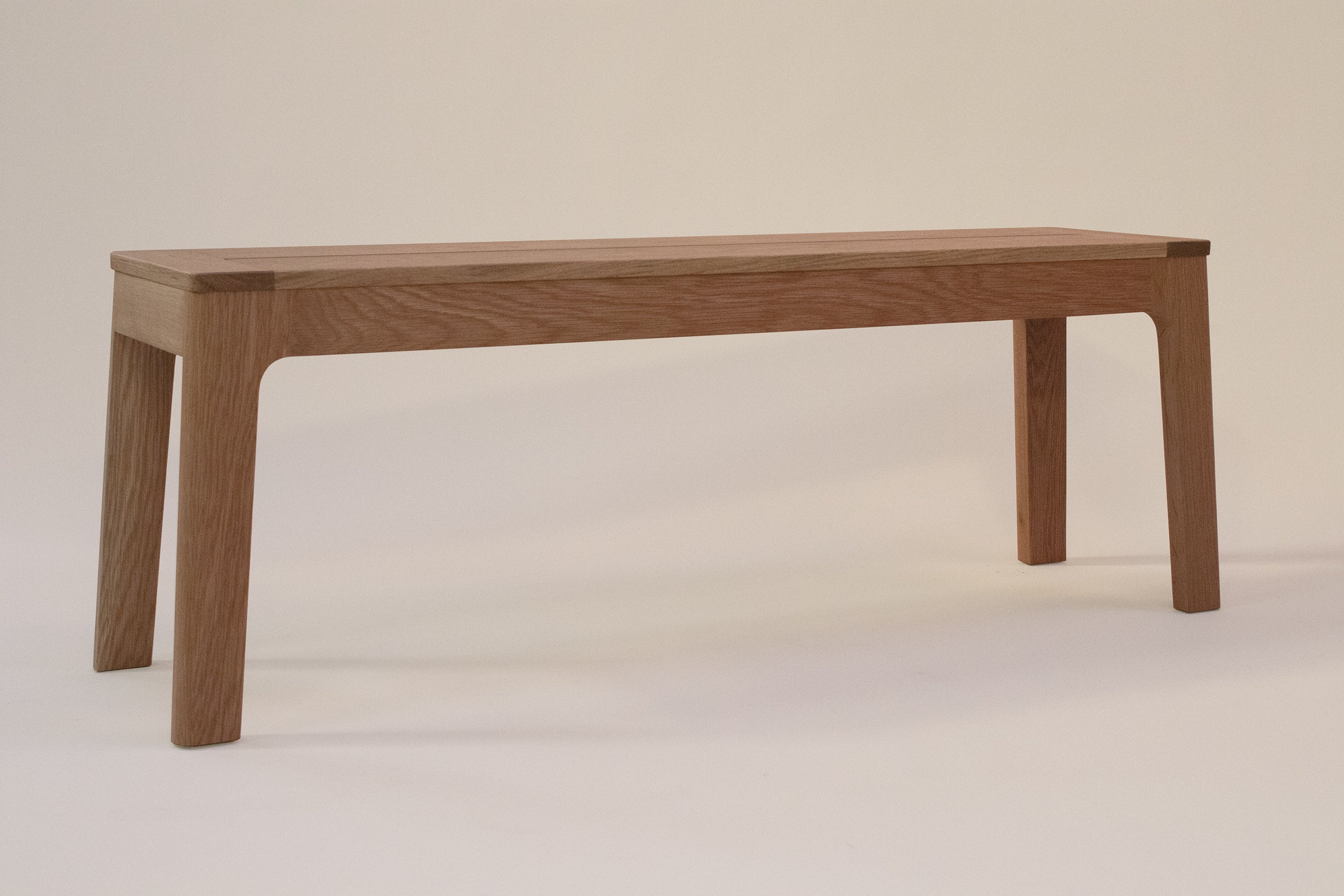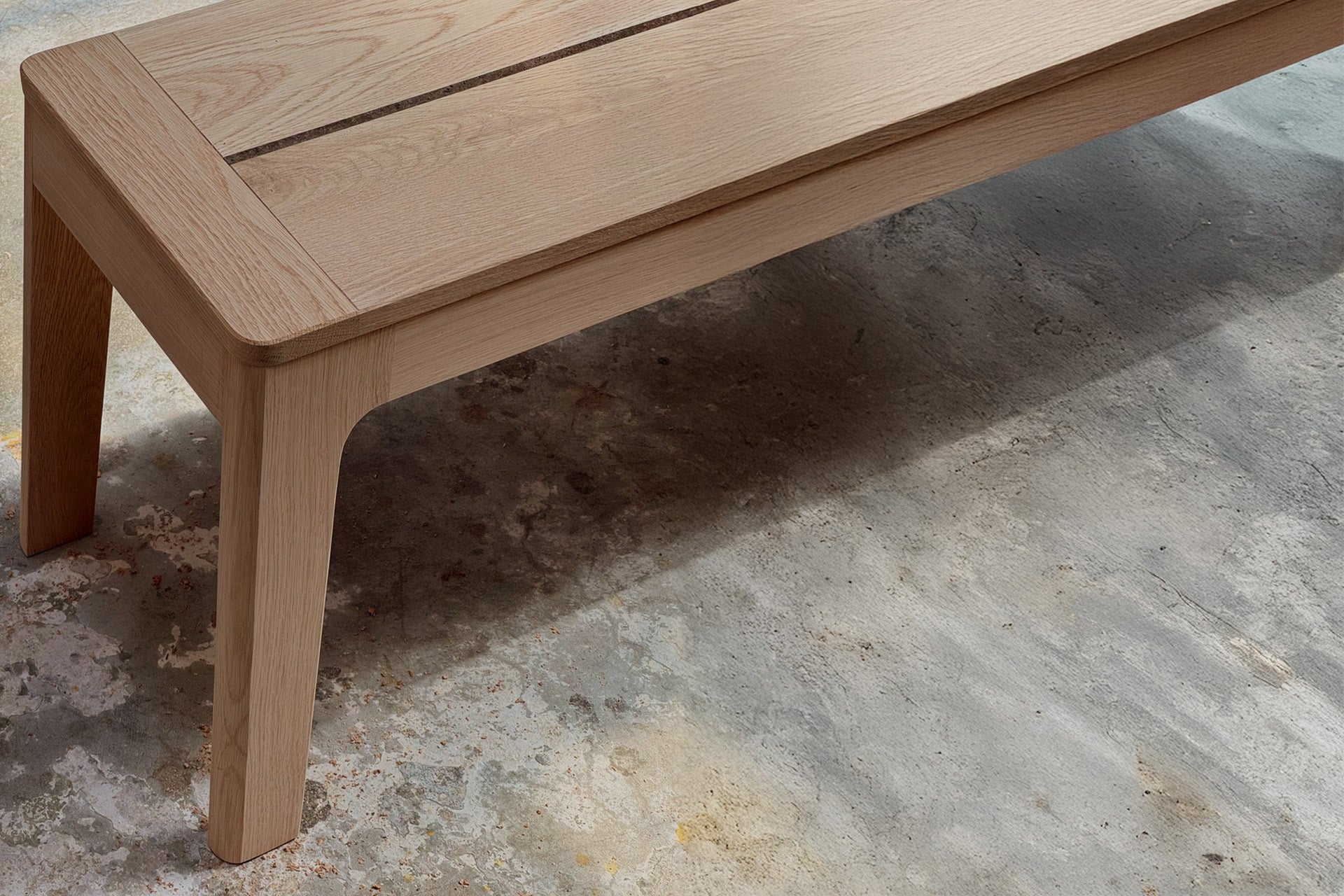 Arno? Ah, Yes! That's the standard response to our latest offering in the world of bench seating, and for good reason. The Arno features a unique charcoal cork expansion joint to its top and solid breadboard ends, each delineated by a subtle, hand-planed chamfer at the joint. The outer edges of the joint are fixed so that all expansion and contraction happens at the cork joint and the perimeter of the top remains perfectly flush regardless of seasonal effects on the timber's movement. Pictured here is the 1200 mm variant in both rich walnut and crisp white oak.