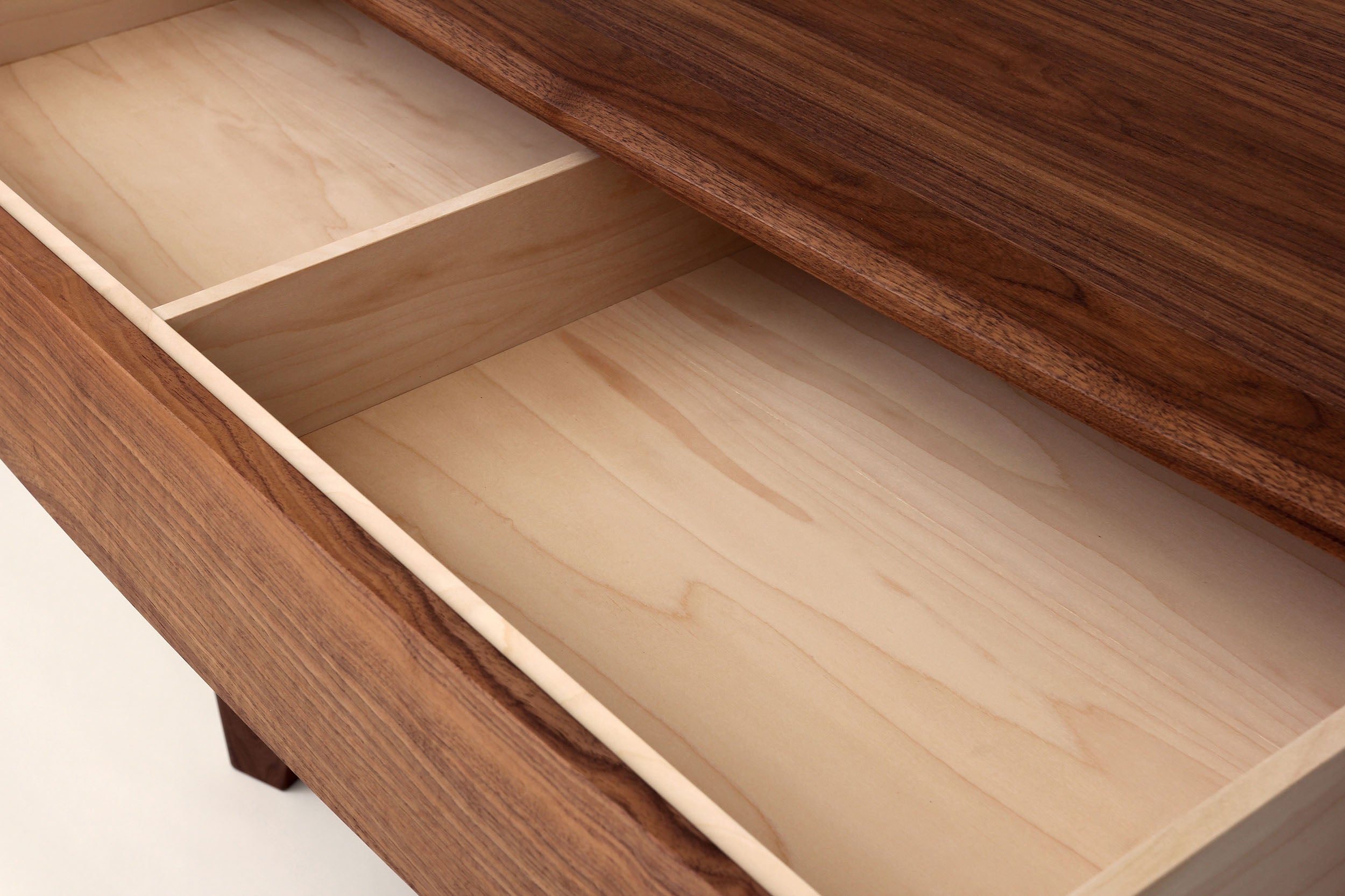 Available in rich walnut (as pictured) or crisp white oak, both with maple veneer drawers.